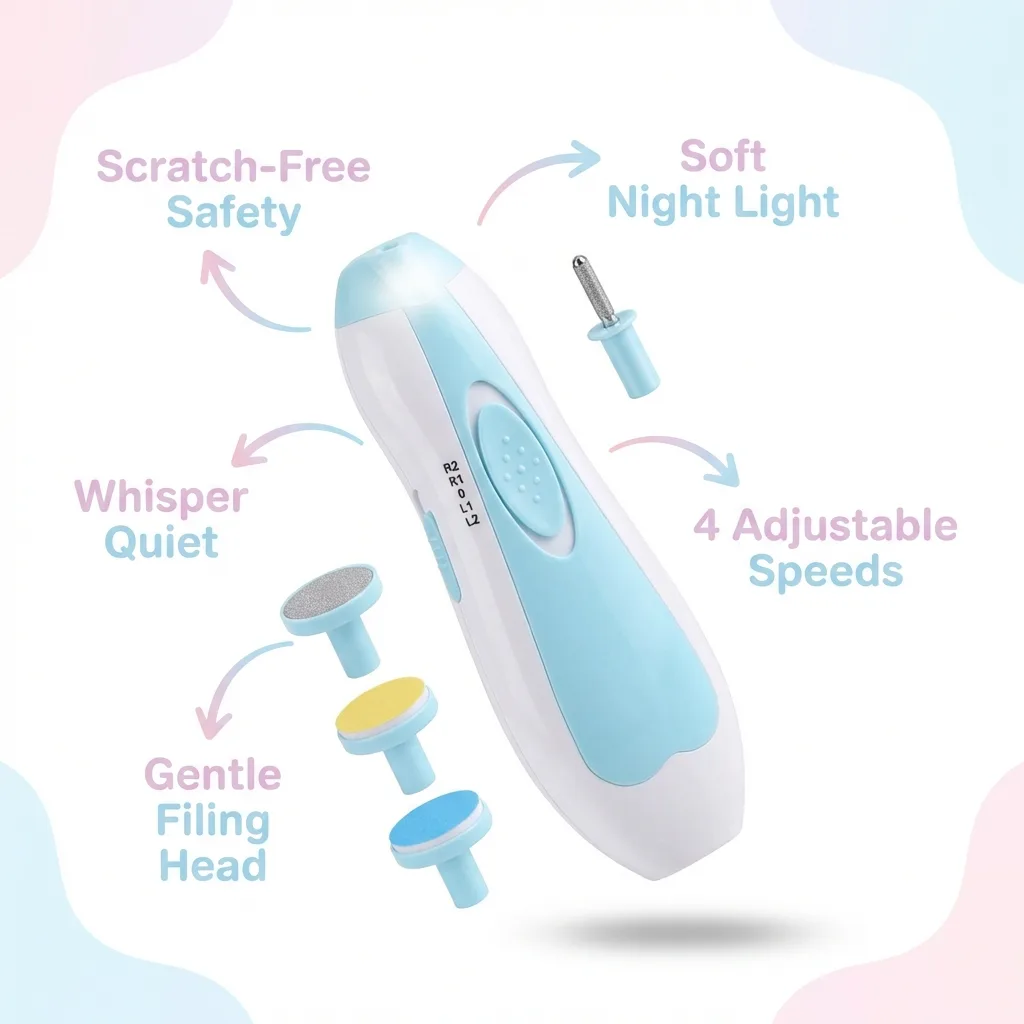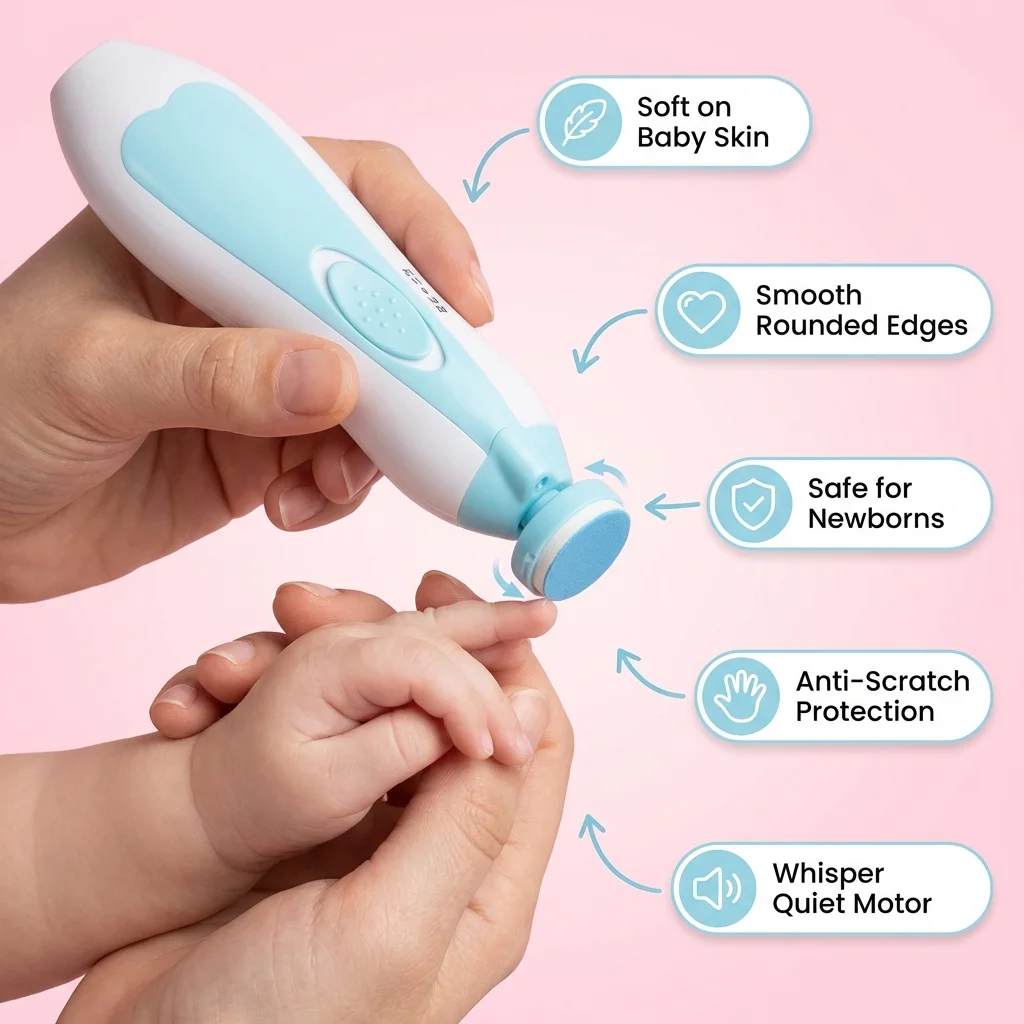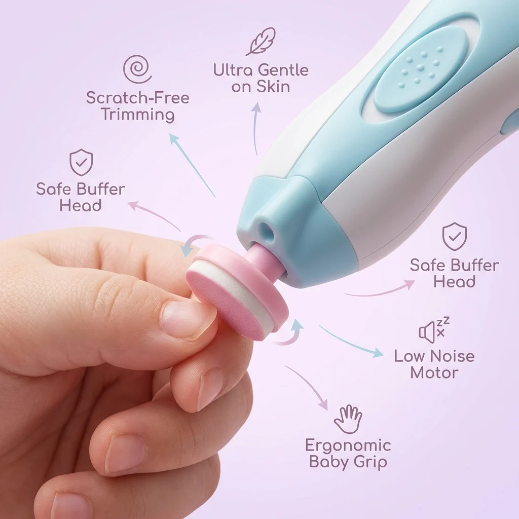 Safe, Gentle, and Stress-Free Grooming for Your Little One. Keep your baby’s delicate nails neat and smooth without the risk of traditional clippers. This electric nail trimmer features a whisper-quiet motor and soft filing pads, making it perfect for use even while your baby sleeps.