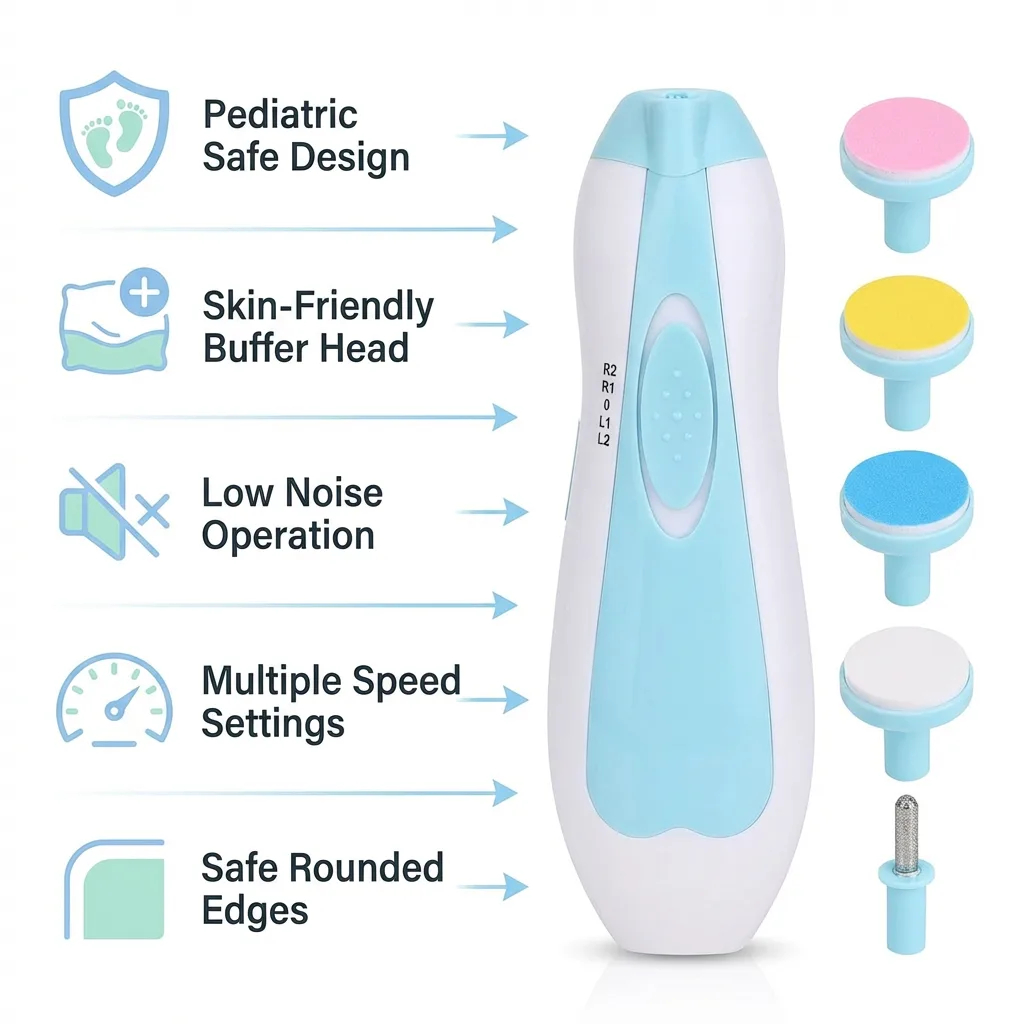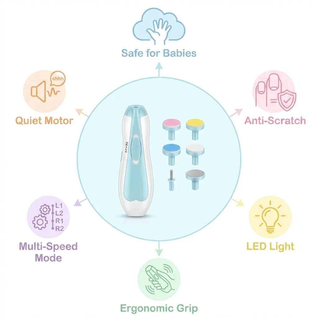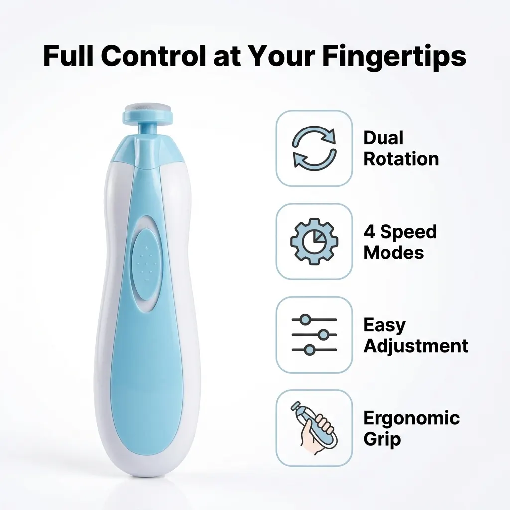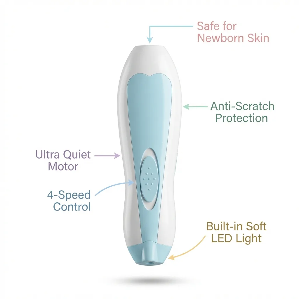 Safe, Gentle, and Stress-Free Grooming for Your Little One. Keep your baby’s delicate nails neat and smooth without the risk of traditional clippers. This electric nail trimmer features a whisper-quiet motor and soft filing pads, making it perfect for use even while your baby sleeps.